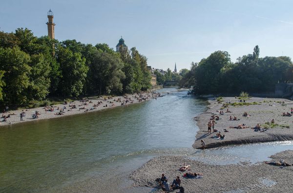 Oder ihr geht einfach weiter entlang der Isar – barfuß durchs kühle Wasser, eine Runde schwimmen, über Kiesbänke spazieren oder auf einer der grünen Inseln entspannen.